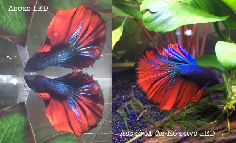 Δηλαδή αν θέλουμε να φαίνονται πιο έντονα τα μπλε-μωβ ψάρια, θέλουμε πιο μπλε-μωβ φως (ψυχρό, ή μπλε led), ενώ αν θέλουμε να φαίνονται πιο έντονα τα κόκκινα ψάρια (platty, κόκκινες ή κίτρινες γαρίδες) τότε θέλουμε περισσότερο κόκκινο φως (θερμό ή κόκκινα led). Άρα όσα περισσότερα μπλε και κόκκινα led έχουμε σε ένα φωτιστικό led τόσο πιο έντονα θα δείχνουν τα ψάρια μας, ενώ όσο πιο πολλά λευκά led έχει τόσο πιο ξεπλυμένα θα δείχνουν.