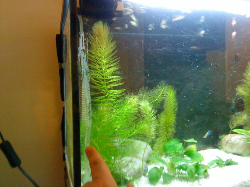 στην δικια μου περιπτωση πριν απο καθε αλλαγη νερου με μια τηλεκαρτα που βρεχω στο νερο του ενυδρειου ξινω το τζαμι ετσι το διατηρω σχετικα καθαρο.