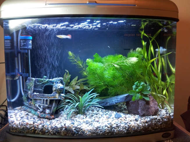 Για να υπαρχει μια εικονα για το ενυδρειο, Ειναι 70l (θεωρητικα, μετα το χαλικι και τη διακοσμηση μπηκαν περιπου 50l νερο) και μετα το μπολιασμα οι μετρησεις πανε αρκετα καλα βασει αυτων που εχω διαβασει και επισης εχω ενα κοντο φυτο με πολλα κλαδακια που κρυβονται μεσα τα μικρα και λιγο κερατοφυλλο φυτεμενο (ξερω χαλαει..) συν κατι anubies, vallisneries και ενα αλλο που δεν ξερω τι ειναι... |
