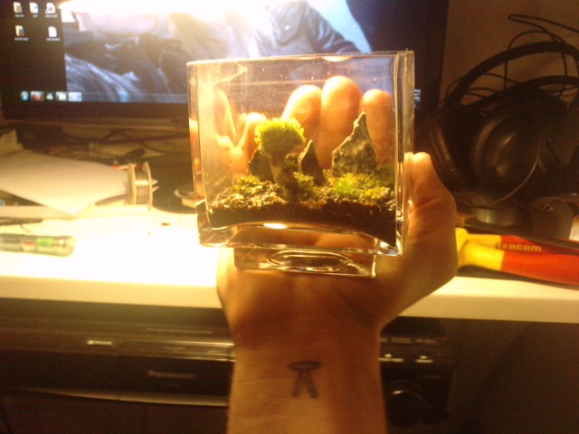 Αρχικα αγοραστικε ως κηροπηγιο, αφου ελιωσε το κερι εμεινε ενα απλο βαζο... Πριν μια εβδομαδα περιπου στο μοναστηρακι ηταν ενας μικροπωλητης με ενα παγκο, ολα ενα ευρο.. Εκει βρηκα ενα φακο λεντ με 12 διοδους, πολυ βολικο σχημα και αμεσως τα συνδιασα, μολις εφτασα σπιτι, εσπασα μια πετρα λαβας πηρα το πιστολι καυτης σιλικονης και κολλησα αρχικα τις πετρες, εριξα το υποστρωμα, ακουμπησα τη μος γεμισα νερακι και ετοιμο!! Τα σχολια δικα σας!!!