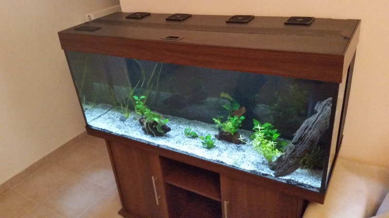Στο προηγούμενο μου ενυδρείο (90 λίτρα καθαρά) είχα 2 μ. λεντοταινία για 6,5 ώρες, αν το δούμε αναλογικά το 1 μ. είναι λίγο άρα σωστά η αυξημένη διάρκεια. Βέβαια θα σου πρότεινα να βάλεις άλλο 1μ. να μειώσεις φωτοπερίοδο με την έννοια ότι είναι πολλές οι ώρες για να είναι τα ψάρια στην "τσίτα". Το ξύλο δεξιά υποθέτω το έβαλες για να κρύψει το φίλτρο, οκ! Όμως θα ήταν καλύτερα αφού σου αρέσει όρθιο, να το μεταθέσεις στην αριστερή πλευρά, ώστε να μην εμποδίζει την ροή-κύκλο του νερού μπροστά στο φίλτρο, που όντως είναι οριακά ικανό για το ενυδρείο σου. Ίσως από την αριστερή πλευρά να πρόσθετα μόνιμα αερα αντλία-πέτρα για να έχω καλύτερη ανατάραξη-κυκλοφορία, λόγω αυξημένου μήκους του ενυδρείου. Συγχαρητήρια για την προσεγμένη δουλειά στο καπάκι-ανεμιστήρες. Τέλος, τι είναι τα σχοινιά που φαίνονται στις φωτογραφίες...; κόφτα, αν είναι ρίζες από τις valisneria κλάδεψέ τες λίγο και φύτεψέ τες.