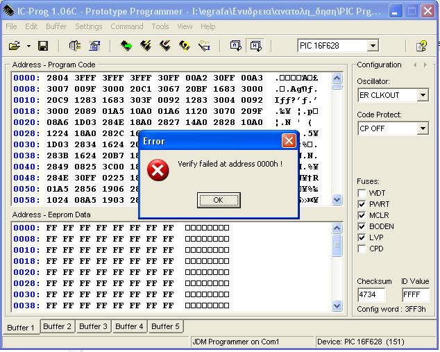 οκ μέχρι εδώ τώρα κόλλησα σε σε άλλο πρόβλημα πατάω erase all για τυχόν άλλο πρόγραμμα μου λέει οκ πατάω read all και μου βγάζει όλες τις γραμμές του κώδικα μηδενικά (λογικά είναι άδειο) οκ ανοίγω το αρχείο f.hex οκ ανοίγει πατάω program all και βγάζει "verify failed at address 0000h" (φώτο 1) πατάω ξανά read all και μου βγάζει όλες τις γραμμές του κώδικα μηδενικά όπως πριν, αν με αυτό(εννοώ τα μηδενικά σαν πρόγραμμα ) πατήσω program all βγάζει "device successfully verified" (φώτο 2) τι κάνουμε εδώ δεν μπορώ να βρω κάτι στο Internet. γνωρίζει κανένας τπτ ; |