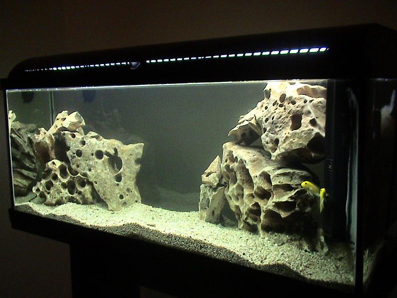 Χώρισες πολύ έξυπνα το ενυδρείο σε δύο ζώνες και έβαλες πολύ ωραίες πέτρες(αν μπορείς βάλε και ένα άλλο είδος να έχει το καθένα το μέρος αναπαραγωγής). Εγώ θα έβαζα και λίγα φυτά για να σπάσει η μονοτονία της πέτρας και απο πίσω ένα φόντο μπλέ σκούρο(αυτοκόλητο που χρησιμοποιούν η επιγραφάδες στην δουλεία τους). Μ αρέσει και ας είναι malawi |