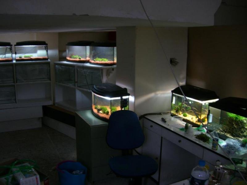 Σκέφτηκα ότι η επιλογή γαριδοενυδρείου σε γραφείο ήταν πολύ καλή ιδέα αφού δεν απαιτούσε μεγάλο ενυδρείο και θα μπορούσα να το κάνω και φυτεμένο που μου άρεζε. Πολύ σύντομα όμως τα φυτά πέρασαν σε δεύτερη μοίρα και τελικά το ενυδρειάκι κατέληξε να έχει μόνο Christmas moss. Αυτός ο μικρόκοσμος που είχα αποκτήσει με είχε συνεπάρει και άρχισα να ψάχνω για καινούρια είδη αλλά προς μεγάλη μου απογοήτευση δεν έβρισκα πουθενά στην Ελλάδα γι αυτό και στράφηκα προς Γερμανία. Πολύ σύντομα το ένα γαριδοενυδρείο δεν μου έφτανε και αφού δεν υπήρχε η δυνατότητα να εγκαταστήσω νέα στο σπίτι αποφάσισα να εκμεταλλευτώ ένα υπόγειο που χρησίμευε ως αποθήκη. Underground λοιπόν και μόνο γαρίδες! Υ.Γ. Δυστυχώς το άθλημα της φωτογραφίας δεν το κατέχω και ούτε έχω φωτογραφική μηχανή της προκοπής, Αφήστε λίγο την φαντασία σας ελεύθερη! Οι φώτο τραβήχτηκαν την πρώτη μέρα προσαρμογής και προτού γίνει η διαλογή. Αυτή την στιγμή υπάρχουν 12 ενυδρεία διαθέσιμα και το σκεπτικό είναι να γίνουν species tanks. Το βασικό μου πρόβλημα είναι να καθαρίσω από τις red cherry αλλά τελικά αποδεικνύετε δύσκολο το εγχείρημα αφού κάθε μέρα βρίσκω και από καμία μέσα στα ενυδρειάκια.