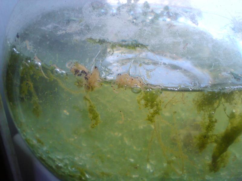 Λοιπόν σας έχω θεματάκι... Είχα αφήσει μια γυάλα έξω στο μπαλκόνι μου, είχα ρίξει μέσα λίγη java moss και ένα hygrophylo, τα οποία φυσικά σαπίσανε. Αυτό το έκανα με τη σκέψη να παράξω άλγη, για να φτιάξω μια δική μου τροφή με βαση την άλγη, για να ταίζω γαρίδες και γλύφτες. Αλλά σήμερα αντίκρισα αυτά τα μικρά 'σκουλικάκια' μπροστά μου. Υποθέτω πως είναι προνύμφες κουνουπιών νεογέννητες! Αν όντως είναι προνύμφες κουνουπιών, μπορώ να ταίζω τα ψαράκια μου με αυτή την ωραία ζωντανή πρωτεϊνουλα; Θα ήθελα τη γνώμη σας!