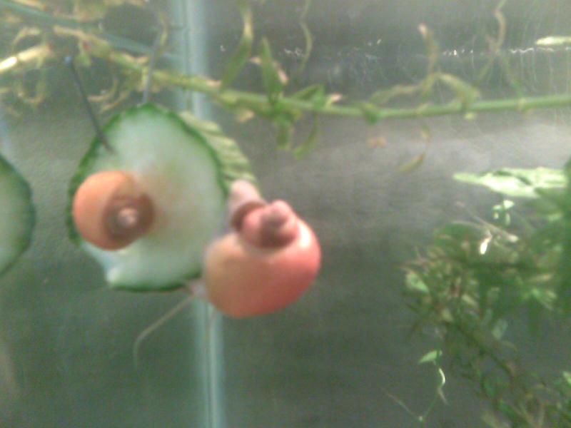 πρίν απο λίγες μέρες άρχισα να δοκιμάζω διάφορα λαχανικά στα apple snails ...τους έβαλα καρότο , μαρούλι , μπρόκολο....τα τιμούσαν όλα μα με αυτο που μόλις το βάλω σε 10 λεπτα το έχουν περικυκλώσει όλα είναι το αγγούρι ... να μερικές φωτογραφίες