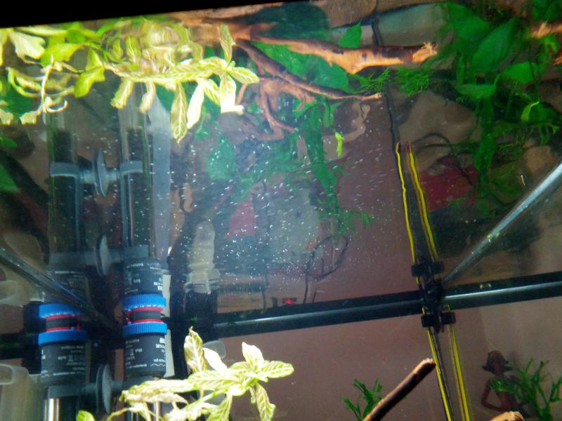 Όγκος:63 λιτρα - 50 καθαρα Κατηγορία:Κοινωνικό - Φυτεμένο Φυτά:limnophilla sessiflora, bacopa caroliana, hygrophilla diformis, rotala rotundifolia, hygrophilla polysperma rosandevig,moss balls, anubias nana, microsorum crispy leaves( θα προστεθει σιγουρα versicularia moss ) Ψάρια / ¶λλα είδη:20 γαριδουλες red cherry,4 γαριδες amano , 6 σαλιγκαρια clea helena Διακοσμητικά υλικά:πετρες λαβας, ριζα redwood υποστρωμα: jbl manado Φόντο: ακομα τιποτα Φωτισμός: μια λαμπα 15w ,grolux life glo , 6700kelvin, 960lumen Διάρκεια φωτισμού: 7ωρες και 45 λεπτα και ανεβαινω μεχρι να φτασω τις 8 Φιλτράρισμα: fluval 106 εξωτερικο , 4 σφουγγαρια ,2 καλαθακια φουλ ελαφροπετρα υαλοβαμβακα στο τελος Θερμοστάτης: 150w eheim jager Λίπανση: μια φορα την εβδομαδα 1.5ml seachem flourish γενικο λιπασμα ιχνοστοιχια, seachem flourish potassium μια φορα την εβδομαδα 2ml Παροχή CO2: οχι Παράμετροι: pH: 7 Γενική σκληρότητα (GH): Ανθρακική σκληρότητα (ΚΗ): Αμμωνία (ΝΗ3): 0 Νιτρώδη (ΝΟ2): 0 Νιτρικά (ΝΟ3): 10-15 (συνεχιζω αλλαγες νερου να πεσουν και αλλο) Αλλαγές νερού: Θερμοκρασία: 24.5 - 25.5C ¶λλες πληροφορίες: τρεχει περιπου 1 μηνα στρωμενο με μπολι και τροφη...ειχα σκοπο να βαλω rasboras galaxy ενα κοπαδι των 10 αλλα εβαλα γαριδες πρωτα και προς το παρον μαρεσει πιο πολυ με αυτες μεσα και θα ηθελα να βαλω και αλλα ειδη.. μερικες φωτο: http://i61.tinypic.com/x10p3o.jpg http://i62.tinypic.com/5lqh74.jpg http://i62.tinypic.com/1zfdj8.jpg http://i58.tinypic.com/25jwg74.jpg http://i57.tinypic.com/107qex1.jpg πειτε μου αποψεις διορθωσεις..και επισης να ρωτησω: 1.για τις γαριδες να κανω και αλλη αλλαγη νερου να πεσουν μαι αλλο τα νιτρικα; και ποσο % να ειναι η αλλαγη; 2.τι τροφες να παρω για τις γαριδες σε ποικιλια δλδ 2-3 και αν γινεται και σε συνδυασμο με τα clea helena αν χρειαστει να τσιμπησουν μη λιμοκτονησουν τα κακομοιρα 3.ποια ειναι η προτεινομενη ροη του φιλτρου μου και πρεπει να ντυσω την εισοδο του φιλτρου με.καποιο τουλι μη ρουφηξει γαριδες η το γονο τους; 4.οσον αφορα τα λιπασματα καπου διαβασα οτι δε κανει να προσθετουμε γιατι κανουν κακο στις γαριδες ..ισχυει;; ευχαριστω πολυ παιδια |