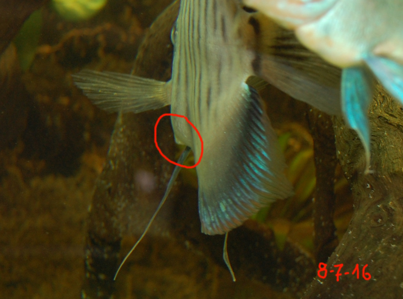 Βέβαια τίποτα ΔΕΝ είναι τυχαίο... λόγω έλλειψης χρόνου από αυξημένες προσωπικές υποχρεώσεις και πολλών ενυδρείων (εκτός των άλλων)... είχα να κάνω αλλαγή νερού πάνω από μήνα... και ακαθάριστα φίλτρα, από τον περασμένο Αύγουστο (22 για την ακρίβεια). Πλησίασα να ταΐσω και ο αρχηγός της ομάδα και πατέρας αρκετών γενεών "παιδιών" μου ΔΕΝ πλησίασε... παρέμενε κάτω από μια ρίζα με μπάρες (stress bars) και τότε πρόσεξα ότι... έχει πρησμένο στομάχι. Από την αριστερή πλευρά μάλιστα... εξείχε κάτι σαν να του είχε "κάτσει" κόκκαλο... |