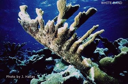 Το κοράλλι που έχει WBD αρχίζει να χάνει τον ιστό του πάντα από την βάση του. Αντίθετα με την BBD δεν φαίνεται κάποιος μικροοργανισμός να είναι υπεύθυνος για την ασθένεια αυτή. Κάποια βακτήρια έχουν βρεθεί σε μολυσμένα κοράλλια αλλά από την άλλη αυτά βρίσκονται και σε υγιή. Εδώ το φιλμ είναι άσπρο δυο χιλιοστών έως 10 πόντων. Η νέκρωση του ιστού μπορεί να φτάσει τα 5 χιλιοστά τη μέρα. 7. Red Band Disease (RBD) Η επαφή πολλές φορές των κοραλλιών μας με κυανοβακτηρίδια, έχει ως αποτέλεσμα την νέκρωση του ιστού από αυτά. Ο νεκρός σκελετός του κοραλλιού σύντομα θα καλυφθεί από τα κυανοβακτηρίδια. 8. Red Bugs (RB) Τα τελευταία χρόνια στα ενυδρεία πολλών χομπιστών έχουν κάνει την εμφάνισή τους τα RB (Tegastes acroporanus). Αυτή η απειλή για όλα τα Acroporidae παίρνει διαστάσεις επιδημίας. Τα RB είναι είδος μαλακόστρακου έχει κίτρινο χρώμα με κόκκινο κεφάλι, με μήκος μόνο περίπου μισό χιλιοστό και είναι πολύ δύσκολο να τα δει κανείς με γυμνό μάτι. Όταν δυστυχώς τα παρατηρήσουμε απλά είναι εκατομμύρια. Τα RB θα αρχίσουν να τρώνε τις Ακρόπορες στο ενυδρείο μας και ειδικότερα την επιφάνειά τους και τα εκκρίματα αυτής. Η ακροπόρα που έχει RB μπορεί να: