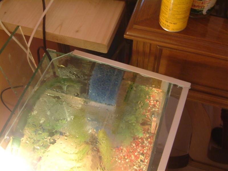 Για ενίσχυση αλλα και για να μην φαίνονται οι όχι τόσο καθαρές κολλήσεις στις ακμές, κολλήθηκε εξωτερικά γωνιακό προφίλ αλουμινίου. Σαν κυκλοφορητής χρησιμοποιήθηκε το τμήμα της αντλίας από το φίλτρο ενός ενυδρείου carrefour 60 λίτρων. Περισσευμένο χαλαζιακό χαλίκι κόκκινου χρώματος (... ...) ενώ για να μην φαίνεται πολύ το μπλέ σφουγγάρι, ράφτηκαν επάνω του με πετονιά πλαστικά φυτά από ....τούρτα γενεθλίων του γιού μου!! Προστέθηκαν ακόμα 2 τεχνητά φυτά (για να μην δείχνει άδειο) συν ένα πήλινο καταφύγιο για τα ψάρια που προτιμούν την μοναξιά.