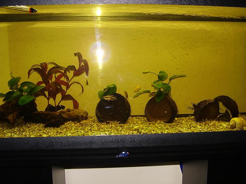 Βάλε περισσότερα φυτά, εύκολα,όπως βαλισνέρια, μικροσόρουμ πτερόπους, κερατόφυλλο κι ότι σ'αρέσει από εύκολα. τις καρύδες έτσι όπως τις έχεις δεν έχουν νόημα, κάνε τους μία τρύπα στο πλάι κ γύρνα τες με τα χείλη στον πάτο για κρυψώνες. θα μπορούσες να προσθέσεις κ καμιά ρίζα ακόμη, πιο μεγάλη. πρέπει να αποφασίσεις τι ψάρια σου αρέσουν, η σύνθεση δεν είναι καλή |