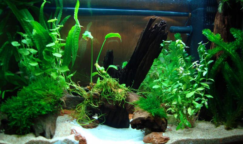 Εγώ θα έλεγα καθόλου φυτά και γαρίδες μόνο ξύλα, ξερά φύλλα στον πάτο blackwater και ένα ζευγάρι ramirezi... Έχω την εντύπωση ότι τα λίτρα φτάνουν... ή κάνω λάθος?