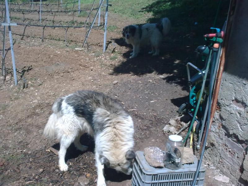 Κι εμείς τα δικά μας τα χορτένουμε από τον χασάπη και ρύζι- μακαρόνια. Όμως δεν είμαστε πολύ ευχαριστημένοι. Πάνε και ξαπλώνουν στον κήπο και σπάζουν τα φυτά. Στο αμπέλι ούτε κατά διάνοια να τα αφήσουμε την εποχή που φουσκώνουν τα μάτια, και μετά. Μόνο όταν είναι "ξερό". Περνάνε κάτω από τα κλήματα και τα ταρακουνάνε τόσο, που σπάζουν ότι εξέχει, μάτια, κλαδάκια, τσαμπάκια! Είναι κανονικές αρκούδες! άχαρα! αλίμονο αν μας χτυπήσει η ουρά που κουνιέται από χαρά, αλίμονο αν μας πατήσουν σε γυμνό πόδι, και αλίμονο αν σκεφτούν να κάνουν χάρες ορμώντας επάνω μας! Δεν μπορούμε να τα χαρούμε! Έχεις τέτοια προβλήματα;