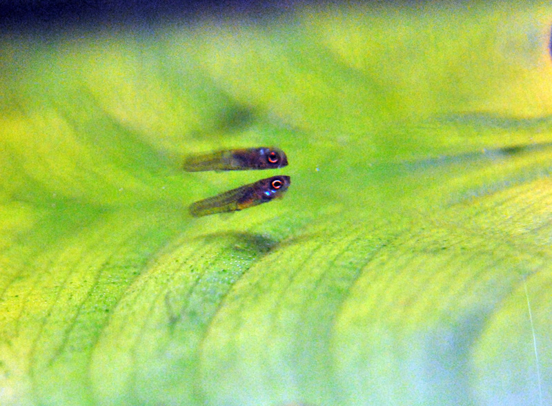 Μεσα στο ενυδρειακι ειχα 3 μωρα Pseudomugil και αρκετα εντλερακια. Τωρα βρισκω μονο 2 Pseudomugil αρα το 1 που λειπει ηταν αυτο το περιεργο ψαρακι. Ο νους μου πηγε στα goby που γεννησαν καποια στιγμη στο υφαλμυρο αλλα δεν ειχα χωρο να τα χωρισω και δεν επεζησε ο γονος.Αλλα αν ηταν goby θα ειχε βγαλει ηδη ριγες εδω και 1 μηνα που το εχω ![]() Σημερα ειναι καθισμενο πανω σε ενα φυλλο ανουμπιας κοντα στην επιφανεια (ποτε δεν κολυμπαει στα ανοιχτα). Το εβγαλα μερικες φωτο αλλα και παλι με την μεγενθυνση δεν μπορω να καταλαβω τι ειναι.. Μαλλον θα πρεπει να περιμενω λιγο καιρο ακομη για την αναγνωριση. |