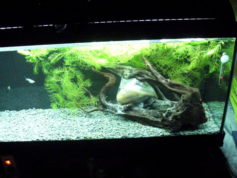 Την πετρα δεν χρειάζεται να την έχεις σε σακούλα πλυντην καλά και βαλτην πάνω στο ξυλο ,τα guppy θέλουν σκληρό νερο και αλκαλικο ph. Ωραίο το ενυδρειο σου Και εγω θα τον έκανα λίγο πιο ανισόπεδο τον βυθό και θα πρόσθετα λίγες πετρες ακόμα.