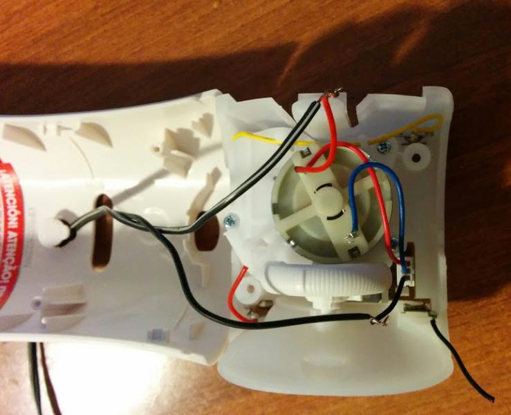 Ανοίγωντας το αποσμητικό φαίνεται καλύτερα ο μηχανισμός. Υπάρχει ένα μοτερ το οποίο γυρίζει μόλις πάρει σήμα και ο κόκκινος μοχλός πιέζει το σπρέι αρώματος που είναι από κάτω. Έχει 4 ρυθμίσεις: off και 3 ρυθμίσεις αυξανόμενης συχνότητας δόσεων, είχα μετρήσει τους χρόνους στο περίπου (ανά 10, 25, 35 λεπτά νομίζω) αλλά δε τους θυμάμαι ακριβώς (και δε μου χρειάζονται με τη συγκεκριμένη κατασκευή).
