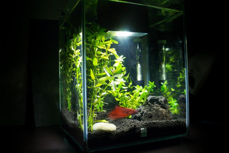 έχοντας σχεδόν στρώσει το ενυδρειάκι, με με διάφορα απρόοπτα, σας το παρουσιάζω εδώ. Διαστάσεις: 25X25X32 FLUVAL CHI Όγκος: 19L Κατηγορία: Νανο Φυτεμένο (Low tech) (θα ήθελα να γίνει…) Φυτά: Hygrophila polysperma, Bacopa Caroliniana, (προσεχώς Ανούμπια νάνα) Ψάρια / ¶λλα είδη: Betta Splendens Διακοσμητικά υλικά: Πέτρα Λάβας - Βότσαλο (μη ασβεστολιθικό) (χαλίκι, ξύλα κ.λ.π.) Υπόστρωμα: Fluval Stratum Φόντο: Οχι (δοκίμασα μαύρο μάτ χαρτόνι εξωτερικά, αλλά καθρεπτίζονταν ο μονομάχος και το απέσυρα) Φωτισμός: LED (της μαμάς) Διάρκεια φωτισμού: 8-10h Φιλτράρισμα: Φίλτρο (της μαμάς) με προσθήκη mini siporax Θερμοστάτης: 50W Λίπανση: (προσεχώς Seachem Flourish) Παροχή CO2: Οχι Παράμετροι: pH: 7.2 Γενική σκληρότητα (GH): <6 Ανθρακική σκληρότητα (ΚΗ): 6-10 Αμμωνία (ΝΗ3): 0 Νιτρώδη (ΝΟ2): σχεδόν 0 Νιτρικά (ΝΟ3): <10 Αλλαγές νερού: Εβδομαδιαία 25-30% - Prime + προθέρμανση Θερμοκρασία: 25-26 ¶λλες πληροφορίες: Αμμωνία με υγρά SERA, λοιπά eSHa strips Στρώσιμο: Μπόλι δεν κατάφερα να βρώ στην Πάτρα (αγγελία εδώ, παραδίπλα και στο FB), και έγινε με Seachem Stability Αρχικά υπήρχε μια μικρή ρίζα με ανούμπιες νάνα επάνω της, η οποία εμφάνισε ένα μύκητα. Ρωτώντας εδώ μου είπαν ότι ειναι φυσιολογικό και θα φύγει μόνη της σε λίγες ημέρες. 15 μέρες μετά, όχι μονο δεν είχε φύγει αλλά μύριζε άσχημα και έβγαζε μικρά κομματάκια που αιωρούνταν και κάθονταν στα φύλλα των φυτών. Πήρε πόδι, και περιμένω να βρώ καμια ωραία πετρoύλα να μπεί η ανύμπια. Φωτογραφία: |