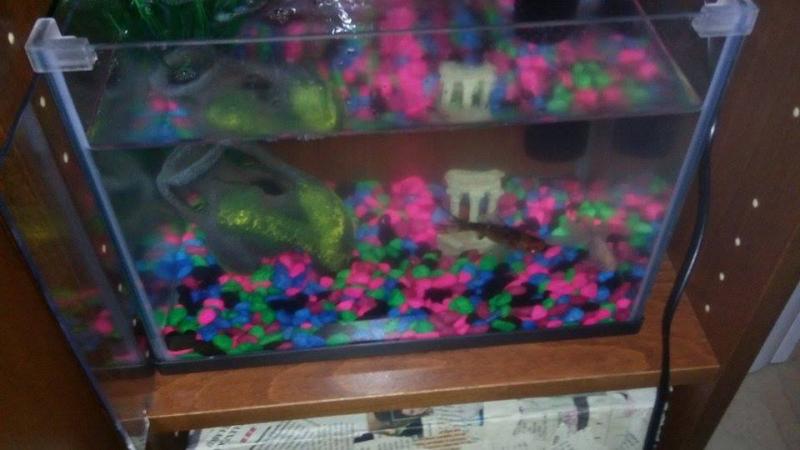 1) το χρωματιστό χαλίκι δεν ειναι καλή ιδέα 2)αν βλέπω καλά εχεις ένα χρυσόψαρο.Αυτο χρειαζετε ένα πολύ μεγάλο ενυδρειο. Πάντα φιλικά. ------------------------- Oχ με πρόλαβε ο hobbit