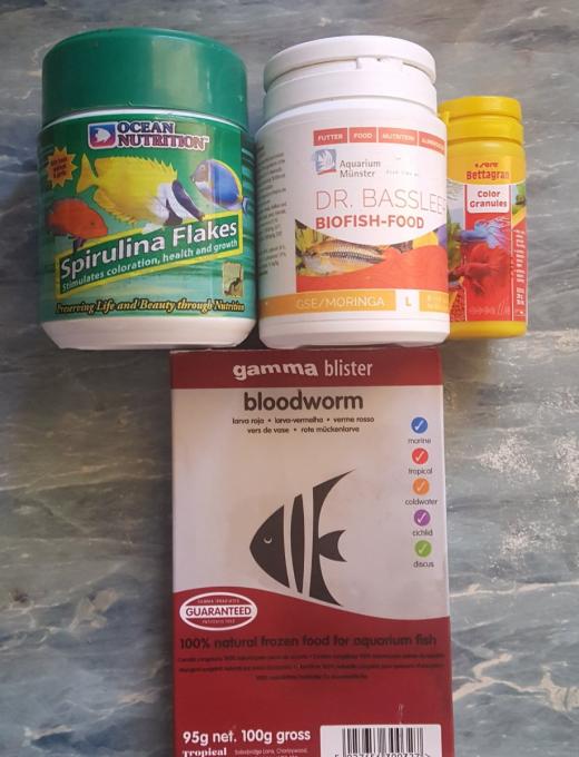 και διάφορες κατεψυγμένες (bloodworms, glassworms, black/white mosquito larvae).