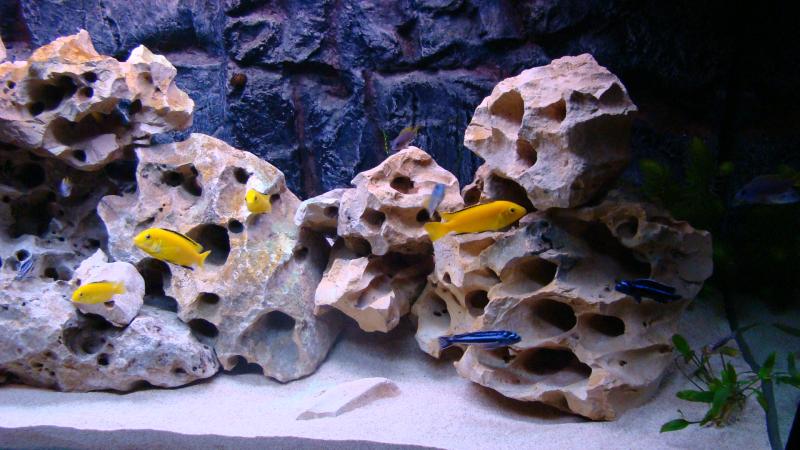 Ακουγωντας και διαβαζοντας τοσο καιρο για mbuna οτι τρωνε φυτα και οτι ειναι μπουλντοζες περιμενα να δω το ενυδρειο μου ανω κατω σε μια βδομαδα μεσα.Οι δικες μου ειναι πολυ ησυχες , ουτε ακουμπανε τα φυτα ουτε πολλους καυγαδες βλεπω.Κατι κηνυγητα πεφτουν αλλα σε ηρεμα πλαισια.Σκοπος μου ειναι να βαλω μια συσταδα απο βαλισνεριες στο ενδιαμεσο των δυο ογκων.Τωρα οι πετρες ειναι καλα σφηνωμενες χωρις σιλικονη και δεν υπαρχει κανενα προβλημα.Αλλωστε γι αυτο επιλεχθηκαν και οι φεγγαροπετρες επειδη εχουν πολλες ακμες και κουμπωνουν ευκολα. |