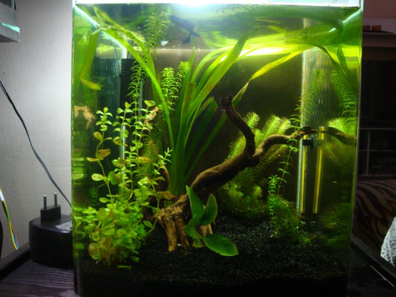 Ανεβαζω και αλλες φωτογραφιες.Εχουν φουντωσει τα φυτα εβαλα και φακη στην επιφανεια. Ανεβηκε και η θερμοκρασια στους 26 °C. Επισης τονωθηκαν και τα χρωματα του μονομαχου.(Οταν τον ειχα παρει ηταν λευκος με λιγο μπλε και κοκκινο στην ουρα.)