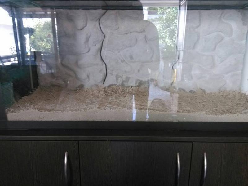Καθαρισα το ενυδρείο καλα με ξύδι και όταν στέγνωσε κόλλησα το background με σιλικόνη απευθείας στο τζάμι του ενυδρείου.. Όπου και θα μείνει ετσι για μια μέρα για να στεγνώσει και να κολλήσει..