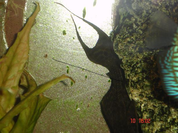 Κατάφερα να πιάσω τον κύριο Λεοπαρδάλις και να τον απομακρύνω από τους Δίσκους.ΟΥΦ Τελικά αποδείχτικε πιο δύσκολο από οτι φανταζόμουν. Οποτε άνοιγα το καπάκι του ενυδρείου εξαφανιζόταν.Ούτε με την τροφή δεν έβγαινε. Εκοψα λοιπόν ένα μπουκάλι νερού και το αφησα μέσα τρείς ημέρες με το καπάκι ανοιχτό γιά να συνηθίση.Πάλι τίποτα και ας έβαζα την τροφή μέσα σε αυτό. Εβλεπα όλα τα άλλα εκτώς από αυτόν.Μέχρι και οι Δίσκοι έμπαιναν. Σκέφτικα μήπως έπρεπε να βάλω ένα μη διάφανο μπουκάλι αλλά σήμερα βγήκε βόλτα έβαλα την απόχη μέσα και .......μπήκε μόνος του μέσα σε αυτήν. Τόσος κόπος πατέντες και αυτός μας κορόιδεψε. Ευτυχώς απομακρίνθηκε - είχε γίνει αρκετά επιθετικός στους Δίσκους και τα άλλα μικρά.