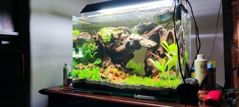 λόγω κατάστασης δεν κατάφερα να φτιάξω ακόμα το ενυδρείο στα 180lt που ήθελα, αντ' αυτού όμως άλλαξα γυάλα και πήγα σε παρόμοιες διαστάσεις με αυτό που είχα, αυξηθήκαν λίγο τα λίτρα και έβαλα το eheim 2217 σε λειτουργία αντί του 2215. Συγκεκριμένα το ενυδρείο έχει διαστάσεις 50x39x36 και μικτά είναι 70lt, καθαρά δεν έχω μετρήσει ακόμα πόσο είναι μιας και είμαι στις πρώτες μέρες που τρέχει με βιολογικό υλικό από το παλιό φίλτρο. Για φωτισμό έχω τοποθετήσει ένα Chihiros wrgb 2 49w, η φωτοπερίοδος μαζί με ανατολή και δύση είναι στις 10 ώρες, αλλά full μόνο τις 8. Επιπρόσθετα εισάγω co2, γενικό λίπασμα και trace της seachem, για υπόστρωμα έβαλα Dennerle Deponit Mix Black 10in1. Σαν έξτρα να αναφέρω lily pipe και κάποιες ώρες ανοίγω την Sicce Nano Voyager 2000 Lt . Έχω φτιάξει σχετικά "πρόχειρα" το aquascape και διαφορετικά από ότι είχα αρχικά στο μυαλό μου γιατί δεν βουλιάζανε τα ξύλα. Τα φυτά τα έχω βάλει 7 μέρες πριν από την φωτό, monte carlo μπροστά για χαλί και πάνω στην αριστερή πέτρα που κρατάει τη ρίζα κάτω, Rotala indica Bonsai στο πλάι δεξιά και πίσω σαν background, Eriocaulon cinerum δεξιά μπροστά, Staurogyne repens αριστερά μπροστά και από πίσω anubia, Riccia fluitans δεμένη με τούλι σε πέτρα πίσω αριστερά δίπλα από μία ριζούλα monte carlo, αλλά και στην πέτρα πάνω δεξιά που κρατάει την ρίζα κάτω. Μπορείτε να δείτε και τις φωτό! Ακόμα είμαι σε σημείο όπου παρατηρώ πως πάνε τα πράγματα και κάποιες από τις παρατηρήσεις μου είναι ότι, το νερό σιγά σιγά δεν είναι τόσο κίτρινο εξαιτίας των τανινών από τις ρίζες. Το c02 φαίνεται να είναι οκ στις 140 φυσαλίδες το λεπτό, σύμφωνα με το drop checker είναι πράσινο προς κίτρινο, τα ψαράκια δεν αναζητούν οξυγόνο, καθώς και τα φυτά δεν φαίνεται να λιώνουν τα φύλα τους, γενικά αρχίζουν βγάζουν νέες ρίζες και μεγαλώνουν. Όμως το χαλάκι αναζητά το φως και σηκώνετε προς τα πάνω, σε σύγκριση με αυτό που είναι στην πέτρα φαίνεται ότι είναι πιο πίσω στην ανάπτυξη. Το πρώτο ξύλο που έβγαλε χνούδι ήταν αυτό που είχα μέσα στο προηγούμενο ενυδρείο. Οι σωλήνες εισαγωγής εξαγωγής (lily pipes) νομίζω στην κυκλοφορία του νερού δεν είναι το ίδιο αποτελεσματικές όπως οι κλασικές της eheim, φαντάζομαι λόγω της εξόδου που δεν βγαίνει με την ίδια ένταση σε ευθεία ροή αλλά περισσότερο σαν στροβιλισμός, ακόμα δεν έχω κατασταλάξει σε πια θέση θα τις αφήσω. Από εκεί και πέρα, να πω ότι το φωτιστικό το είχα στο κέντρο τις γυάλας για να πιάνει πιο πίσω την Rotala και μερικούς πόντους πιο ψηλά για να έχει λίγο παραπάνω απόσταση από τα φυτά στις πέτρες, αλλά σήμερα το κατέβασα λίγο πιο κάτω και το τράβηξα πιο μπροστά για να δω πως θα πάνε τα πράγματα με το χαλί. Εξ αρχής ήμουν μεταξύ του να πάρω το chihiros ή δύο πιο φθηνά φωτιστικά για να έχω καλύτερη διάχυση, λόγω του ότι το aquascape είναι λίγο περίεργο, ακόμα το σκέφτομαι για ένα έστω πολύ μικρό για να καλύπτει ίσα ίσα πίσω, από την άλλη το ενυδρείο από πάνω το έχω ανοιχτό και θα ήθελα να του βάλω το γυάλινο καπάκι, που σημαίνει ότι θα κόψει και άλλο από το φωτισμό. Το φωτιστικό σαν απόσταση από το βυθό είναι στους 35 πόντους και αν το κατεβάσω τέρμα κάτω μπορεί η απόσταση βυθού - φωτιστικού να φτάσει τους 32 πόντους αλλά θα χάσω ακόμα περισσότερο στην διάχυση στο πίσω μέρος. Αν πήγαινα σε ένα δεύτερο chihiros είναι κάτι που δεν αξίζει λόγω χρημάτων? Επίσης το πολύ πολύ στο πίσω μέρος αν δεν είναι οκ η rotala με το φως μπορώ να βάλω κάποιο φυτό με πολύ μικρές απαιτήσεις σε φως. Βέβαια την συγκεκριμένη στιγμή σκέφτομαι ότι μήπως δεν με καλύπτει όσο νόμιζα 