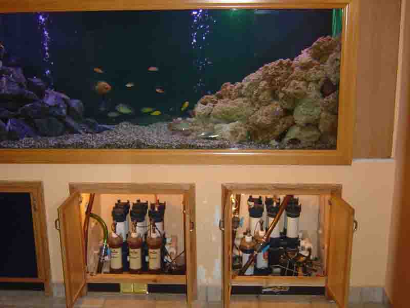 Λίγα λόγια για την θέση του ενυδρείου Το ενυδρείο βρίσκεται στο κεντρικό χώρο της κατοικίας (χώρο υποδοχής) με κύριο σκοπό όταν ο επισκέπτης εισέρχεται στον χώρο σαν πρώτη εικόνα να έχει το ενυδρειο.Εχει χρησιμοποιηθεί σαν μεσοτοιχία μεταξύ υποδοχής και κουζινας.και είναι ορατό και από της δυο πλευρές επίσης ορατό είναι και από το σαλόνι. Η κατασκευή και μελέτη έγινε ταυτόχρονα με την όλη κατασκευή της κατοικίας καθώς επίσης είχε προβλεφθεί και το βάρος που επρόκειτο να έχει. Επισκέψιμο για της αλλαγές νερού τροφής κ.λ.π είναι από το χώρο της κουζίνας ,καθώς επίσης και στο κάτω μέρος του ενυδρείου είναι όλος ο εξοπλισμός του (φίλτρα κυκλοφορίες κ.λ.π) Κατασκευή Κρύσταλλο πάχους 20mmμε 4 τρύπες στον πυθμένα για τις εισαγωγές –εξαγωγές των φίλτρων. Διαστάσεις 3m (μήκος)Χ 80cm (πλάτος)Χ 1m(ύψος) Εξοπλισμός 1) 2 φίλτρα μάρκας LIFEGARD από 6 στοιχεία έκαστο (σύνολο 12) δυο από κάθε πλευρά υπάρχει εξάρτημα σε σχήμα φυσαρμόνικας που κάνει την δουλεία του φιλτραρίσματος και επίσης στο ίδιο φίλτρο στο κέντρο του τοποθετείτε ο ενεργός άνθρακας .Στα υπόλοιπα 8 στοιχεία περιέχουν βιόσφαιρες για τον βιολογικό καθαρισμό. 2) 5 θερμοστάτες της Rena, 300 W ο καθένας, που βρίσκονται μέσα σε 5 στοιχεία του φίλτρου 3) 1 Αεραντλία μάρκας shegoΜ2 Κ3 4) 2 κυκλοφορητές της AQUA MEDIC με κυκλοφορία νερού 3500 λίτρα/ώρα Φωτισμός 8 λάμπες φθορισμού SYLVANIA 120 cm, 36 W Διακόσμηση Χαλίκι ποταμίσιο Πέτρες μαζεμένες από το βουνό Τραγανές Συντήρηση Αλλαγή 10-15% κάθε 15-20 μέρες Καθάρισμα φίλτρων κάθε 10-15 ημέρες καθαρισμός πυθμένα κάθε 2 μήνες Ψαριά Malawiκαι 8 αμερικανές κιχλιδες με σκοπό συντομα να μεταφερθούν σε άλλο ενυδρείο |