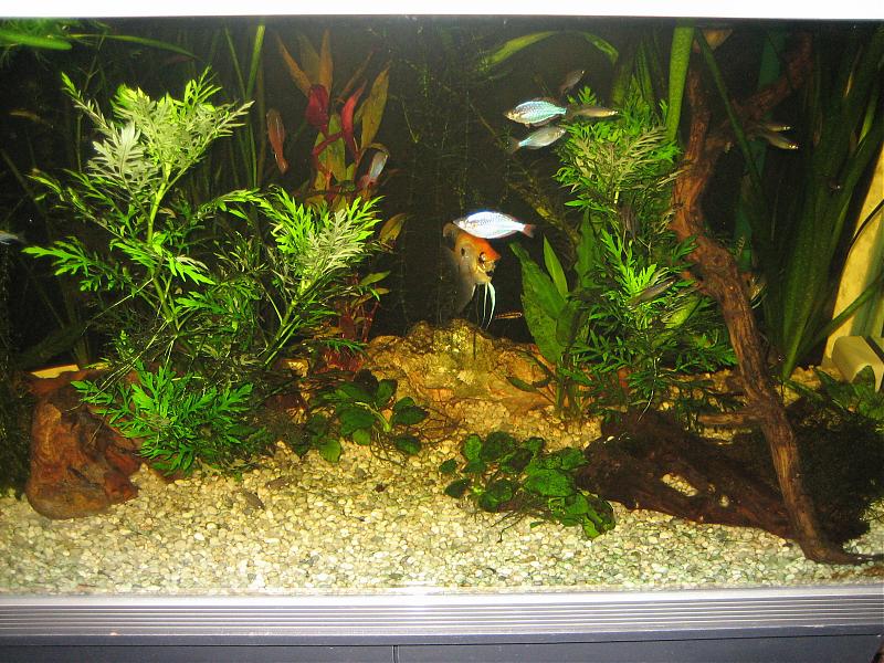 Σήμερα σας παρουσιάζω την πρώτη προσπάθεια μου, έπειτα από 3,5 μήνες λειτουργίας! Όγκος: περίπου 250lt Φυτά: Anubias, Ceratophyllum, Egeria densa, Hygrophila, Valisnerias και ένα με κόκκινα φύλλα που δε θυμάμαι το όνομά του Ψάρια: Iriatherina werneri (6), Melanotaenia praecox (5), Corydoras julii (6), Botia sidthimunki (6) Botia macracanthus(2), Colisa lalia(1m+1f), Ottocinclus affinis (8 ) Pterophyllum scalare (4) Microgeophagus ramirezi (1m+1f). Ancistrous sp. long fin (1) Λάμπες 3: 25w (2 λευκέσ, μία ροζ) Θερμοκρασία: 26 βαθμοί NH3 =0 NO2 =0 NO3=0-5 ppm PH = 7.2 ΚΗ=7 GH=10 Μετρήσεις με υγρά ΑP Φίλτρο: Eheim Professional 3e 2076. Δέχομαι προτάσεις για βελτιώσεις, σχόλια, παρατηρήσεις, κριτικές, κτλ. Με το μαλακο.. Υ.Γ. Η αντίστροφη όσμωση είναι στα υπ'όψην! |