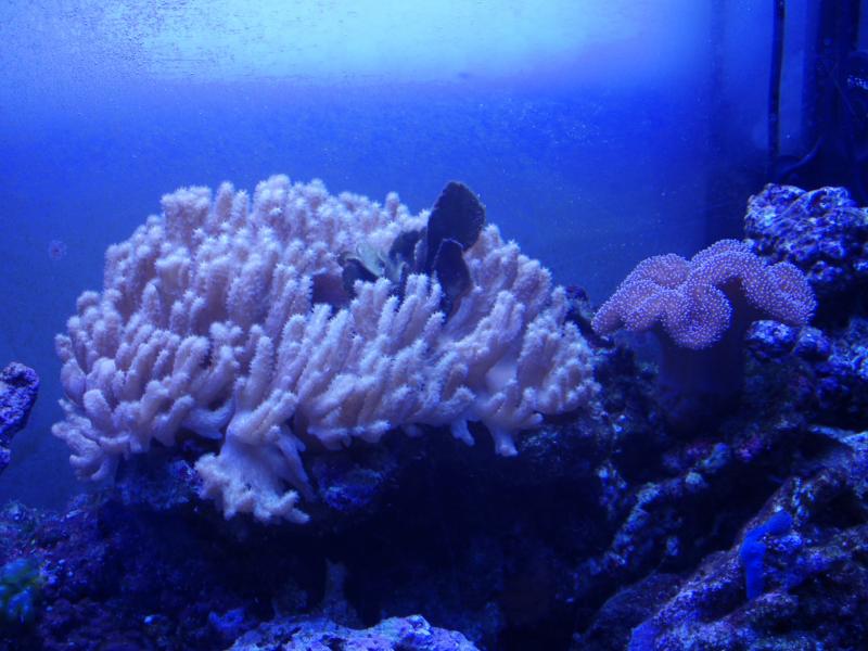 Τα κοραλλια μου ειναι 2 τα οποια θα τα δεις στην συνημενη φωτο που εβαλα και ειναι τοποθετημενα στην μεση του υψους του ενυδρειου, επισης τα polyps και μερικα mushrooms βρισκονται σχετικα κατω κατω. Η αποχρωση του ενυδρειου σαν φωτισμος μου αρεσει αρκετα και πιστευω οτι αρεσει και στους κατοικους αφου ολα ειναι μονιμως ανθισμενα! (τουλαχιστον εδω μου φευγει το αγχος :P ) Τωρα γιαυτο που σου ειπα για την κοκκινη κοραλινη που βγαινει πανω στον βραχο ο οποιος εχει και μωβ κοραλινη πανω του, δε ξερω ποιος ο λογος να βγει. ειναι κοκκινο (ερυθρο) και εχει κρουστα ιδια με της μωβ κοραλινης. οπτικα δεν μου αρεσει παντως το κοκκινο. το ενυδρειο τρεχει για 6 μηνες. αυτη η αλγη που ειναι σαν τριχοειδης και εχει χρωμα κοκκινο και πρασινο ειναι πολυ κοντη και την τρωνε τα ψαρια ολη τη μερα. δεν ξερω τι συμβαινει και νομιζα οτι φταιει το υπερβολικο φως των ασπρων τ5 και γιαυτο το μειωσα. και τωρα εχω τις μπλε να δουλευουν περισσοτερες ωρες απο τις ασπρες. αυτη ειναι η φωτο sorry για την ποιοτητα της |