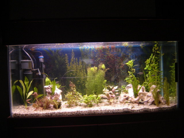 Διαστάσεις:1,10*0,40*0,50 Όγκος:220 λίτρα Κατηγορία:κοινονικο Φυτά:hydrophilla red,hydrocotyne leucocephala,ehinodorus,egeria densa, hydrophilla difformiw , nymphaea lotus, limnophila aromatica, rotala indica , valisneria spirallis 'tiger'' , ludwigia inclinata '' Cuba'', rotala macrandra, ludwigia repens, hydrophilla corymrosa ''compact'' , myriophyllum aquaticum, echinodorus '' red devil'' , alternanthera reineckii '' roseafolia'', ludwigia glandulosa, cryptocoryne wendtii ''brown'' , didiplis diandra , aponogeton crispus, hydrophilla polysperma , microsorum pteropus, anubias barteri var. nana ,cladophora aegagropila (Κάποια είναι αγνώστων λοιπών στοιχείων) Ψάρια / ¶λλα είδη:Σκαλαρια 5 τεμ Διακοσμητικά υλικά:2 πέτρες (χαλίκι, ξύλα κ.λ.π.)3 κιλά υπόστρωμα tetra, λατερίτη, 3 εκ aqualit, 3 εκ χαλίκι (3-5 mm) Φόντο:αφίσα με φυτά Φωτισμός:3*18w osram fluora, 2*18w phillips aqua relle, 1*30w compact Hasse Διάρκεια φωτισμού:11 ώρες Φιλτράρισμα:Εσωτερικό φίλτρο 1100λ/ω Θερμοστάτης:150w eheim Λίπανση:προιόντα seachem Παροχή CO2:diy (2*2 lt) Παράμετροι: pH:7.2 Γενική σκληρότητα (GH):10 Ανθρακική σκληρότητα (ΚΗ):7 Αμμωνία (ΝΗ3): Νιτρώδη (ΝΟ2):0 Νιτρικά (ΝΟ3):15-20 Αλλαγές νερού:κάθε 15 μέρες Θερμοκρασία:27 ¶λλες πληροφορίες:Το ενυδρείο τρέχει ένα μήνα .Προς το παρόν παλεύω με τις άλγες. Θέλω τη γνώμη σας για την διάταξη των φυτών όταν θα είναι σε πλήρη ανάπτυξη. Δέκτή κάθε είδους παρατήρηση Φωτογραφία:Η τελευταία φώτο είναι πρίν ένα μήνα τη μέρα που το έστησα.