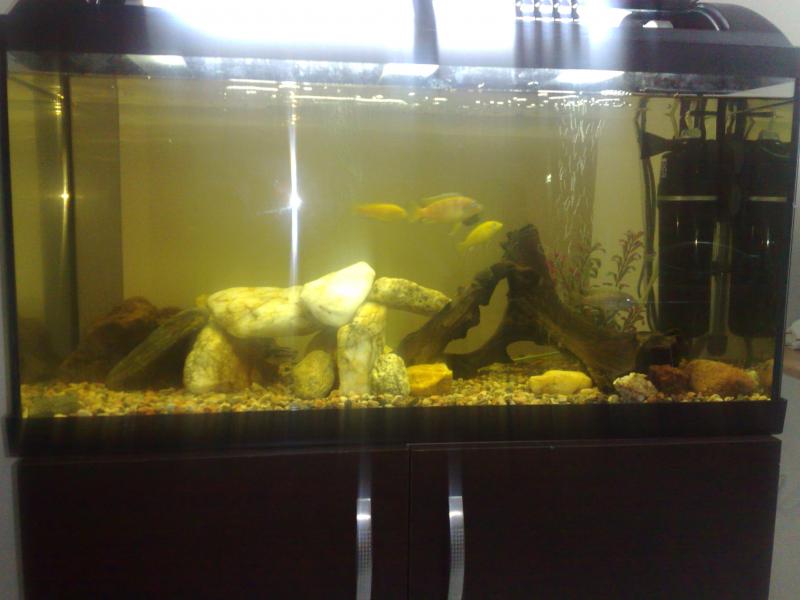 Αυτες οι κιχλιδες ειναι πετροψαρα τους αρεσει πολυ να κρυβονται σε σπυλιες!Πρεπει να κανουμε με πολλες σπιλιες με τις πετρες.Θελουν και ψιλη αμμο γιατι τους αρεσει να σκαβουν.Παρατηρησα οτι το νερο εχει σκουρο χρωμα αυτο μπορει να προερχεται και απο το ξυλο που εχεις μεσα.Καλο ειναι να το βγαλεις γιατι σου μαλακωνει το νερο.Καλο ειναι να εχεις το νερο γεματο μεχρι πανω στο πλαστικο.Στρεσαρονται γιατι ειναι σε πολυ λιγο χωρο πολλα ψαρακια και με πολυ λιγες σπυλιες.Το φιλτρο σου ειναι και αυτο παρα πολυ μικρο και εκτος οτι δεν εχει μεγαλη ροη δεν εχει και χωρο για βιολογικο υλικο.Μπορεις να δεις στην κατηγορια malawi καποια ενυδρια φιλων να παρεις μια ιδεα.