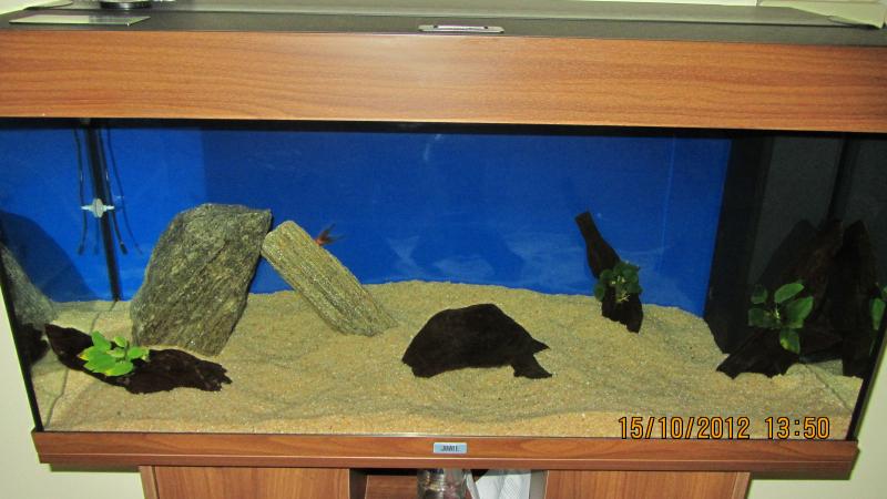 Πληροφορίες: Ειδος ενυδρείου:juwel rio 180 Διαστάσεις:101 x 41 x 50 cm Όγκος: 180 lt (καθαρα 160 lt νερο) Ποικιλιες χρυσοψαρων: 1 common ¶λλοι συγκάτοικοι : στο...μελλον θα προσθεσω ακομα ενα common Φυτά: 1 anumbia nana, 2 anubies barteri gold Διακοσμητικά υλικά: 25 κιλα αμμοχαλικο μπεζ 1mm κοκκομετρια, πετρες, φυσικο ξυλο (χαλίκι, ξύλα κ.λ.π.) Φόντο: αφισα μπλε Εξοπλισμος Φωτισμού/watt: 2x45w T5 Διάρκεια φωτισμού: αρχικα 3 ωρες την ημερα για μια εβδομαδα, μετα περιπου 6 ωρες Μέσα Φιλτράρισματος/αποδόσεις:Filter Bioflow 3.0 600lt/h το ενα καλαθακι του γεμισμενο με περιπου 0,8 λιτρα siporax, το αλλο καλαθακι με 2 σφουγγαρια και μια καλτσα substat pro Μέσα Θερμανσης:Heater 200 Watt Μέσα Ψύξης: το ψαχνω ακομα... Λίπανση: Παροχή CO2: Παράμετροι: pH:8 Γενική σκληρότητα (GH):8 Ανθρακική σκληρότητα (ΚΗ):5 Αμμωνία (ΝΗ3):0 Νιτρώδη (ΝΟ2):0 Νιτρικά (ΝΟ3):0 Αλλαγές νερού(% και συχνότητα): Θερμοκρασία (μέση τιμή):26 ¶λλες πληροφορίες:Το 'μπολιασμα' εγινε χτες. Εκανα μετρησεις σημερα και δεν εχω δει ακομα νιτρικα... Φωτογραφία(ες): |
