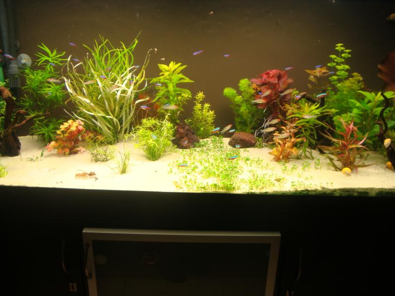 η άμμος είναι στο ενυδρείο 3 χρονια co2 περίπου 200 φυσαλίδες το λεπτο φωτισμός: σύνολο 5 λάμπες t5 54 w 4 grow 1 dey lite 1 dey και 1 grow ανάβουν 8 ώρες και οι άλλες 3 4 ώρες ενδιάμεσα λιπάσματα: seachem σίδηρος 6 μέρες από 5 ml flourish 3 μέρες 2 ml τρεις 3 μέρες 10 ml κάλιο 6 μέρες 5 ml φώσφορος 6 μέρες 2ml το ενυδρείο τρέχει με φυτά co2 και +3 λάμπες 1 μηνα και νομίζω πως τα πάει καλά η φωτογραφία είναι μετά το πρώτο κλάδεμα |
