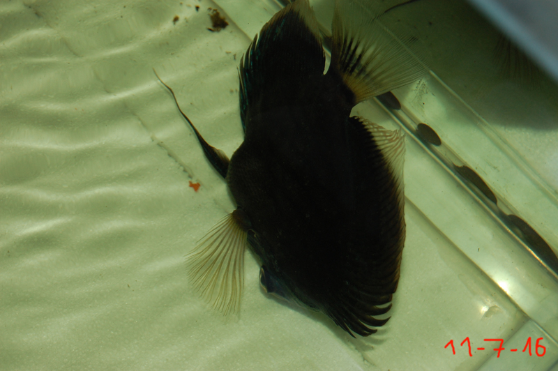 Βέβαια τίποτα ΔΕΝ είναι τυχαίο... λόγω έλλειψης χρόνου από αυξημένες προσωπικές υποχρεώσεις και πολλών ενυδρείων (εκτός των άλλων)... είχα να κάνω αλλαγή νερού πάνω από μήνα... και ακαθάριστα φίλτρα, από τον περασμένο Αύγουστο (22 για την ακρίβεια). Πλησίασα να ταΐσω και ο αρχηγός της ομάδα και πατέρας αρκετών γενεών "παιδιών" μου ΔΕΝ πλησίασε... παρέμενε κάτω από μια ρίζα με μπάρες (stress bars) και τότε πρόσεξα ότι... έχει πρησμένο στομάχι. Από την αριστερή πλευρά μάλιστα... εξείχε κάτι σαν να του είχε "κάτσει" κόκκαλο... |