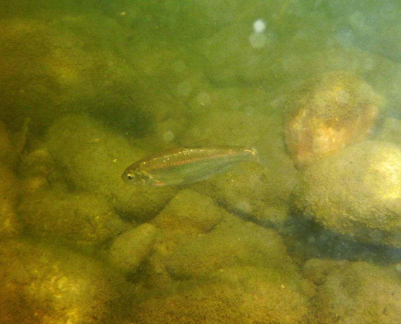 η βουτια στο σημειο που ονομαζεται "πυλες του Αδη". ειδα δυο ειδη αν και σιγουρα υπαρχουν περισσοτερα. περσυ στο ιδιο σημειο οπου η σταθμη του νερου ηταν ψηλοτερα και το νερο πιο κρυο με μεγαλυτερη ροη,ειχα δει και πεστροφες πχ. τα δυο ειδη που ειδα κολυμπουσαν μαζι. αν και το ενα(το πιο μεγαλο) κινουνταν πιο κοντα στο βυθο. ο βιοτοπος αποτελειται απο ποταμισιες πετρες (οι περισσοτερες ασβεστολιθικες),λασπη,ξυλα και φυλλα πλατανου και σκληθρου και αρκετη αλγη.τα ψαρια κινουνταν πολυ στα σημεια με τις πετρες και ειδικα το μεγαλυτερο ειδος απτα δυο τρεφονταν απο τις αλγες πανω τους. η θερμοκρασια του νερου περιπου στους 15 βαθμους με μικρη εως μετρια σχετικα ροη.(δυστυχως δεν ειχα το tds meter μαζι μου τα ψαρια κινουνταν κυριως στα σημεια με τη χαμηλοτερη ροη, ενω ο γονος ερχοταν πανω μου κατα εκατονταδες και με τσιμπαγε πολυ ελαφρα(σχεδον ευχαριστα το βαθος στα σημεια οπου τα ειδα σε μεγαλους αριθμους,απο μισο εως εναμιση περιπου μετρο. |
