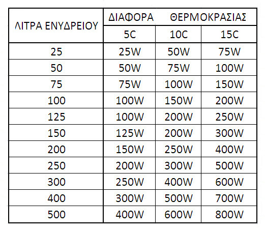 ![]() Για τα συνηθη ενυδρεια ειναι ενας καλος μπουσουλας. Ο φιλος εχει 12-14 θερμοκρασια χωρου, και 350 περιπου λιτρα (300 καθαρα υποθέτω). Ας μας πει μεχρι ποση θερμοκρασια μπορει να του ανεβασει ο 300αρης θερμαντηρας για να δουμε αν ειναι κοντα στο πινακακι. Βεβαια για το Schego θα πρεπει να διαφερει καπως η αναλογια.