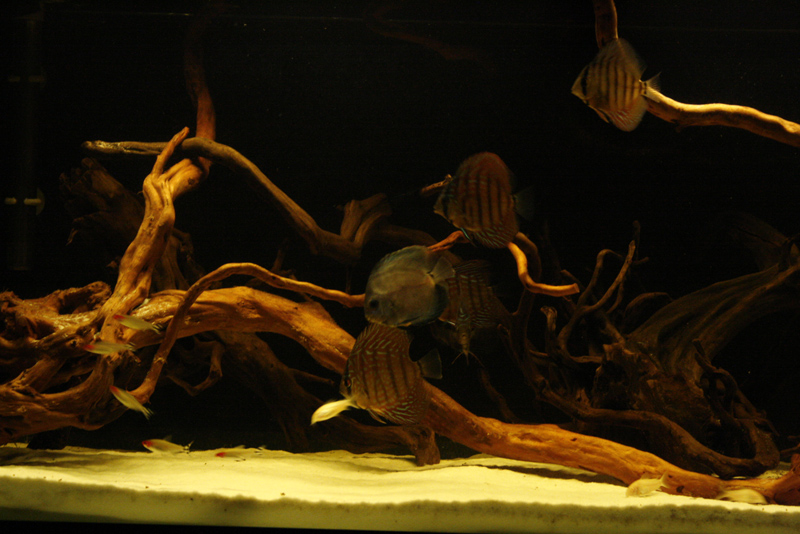Προτάσεις / γνώμες φυσικά ευπρόσδεκτες. Πληροφορίες Διαστάσεις: Rio 240 Όγκος: ~200l Καθαρά Κατηγορία: Δίσκοι Φυτά: Ούτε για δείγμα Ψάρια / ¶λλα είδη: 7 δισκόπουλα, 5 ροδόστομα, 5 κόρυ albino (δεν είχα βρεί άλλα εδώ γμτ ) Διακοσμητικά υλικά: Ξύλα Red Moor wood, λευκή άμμος (χαλίκι, ξύλα κ.λ.π.) Φόντο: Μαύρο αυτοκόλλητο Φωτισμός: κλειστές λάμπες φθορίου, ο φωτισμός προέρχεται από ταινία LED "warm white" Διάρκεια φωτισμού: 7 ώρες Φιλτράρισμα: eheim 2236 full στο siporax Θερμοστάτης: τιτανίου 300W, Eliwell Λίπανση: τί να την κάνω? Παροχή CO2: όχι Παράμετροι: pH: 6.15 Γενική σκληρότητα (GH): 3 Ανθρακική σκληρότητα (ΚΗ):1 (μπορεί και λιγότερο) Αμμωνία (ΝΗ3):0 Νιτρώδη (ΝΟ2):0 Νιτρικά (ΝΟ3):~10 Αλλαγές νερού: 50 λίτρα / 4 μέρες από Α/Ο (μερικές φορές και πιο συχνά) Θερμοκρασία: 30 ¶λλες πληροφορίες: discus Trace Φωτογραφία: