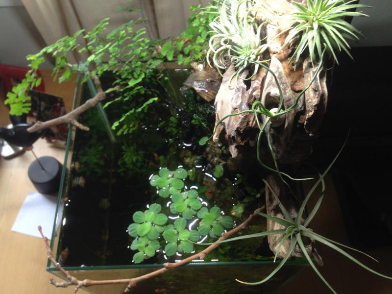 Το buenos aires tetra πήγε με τους γονείς του. Στο ενυδρείο προστέθηκαν το καλοκαίρι 5 κίτρινες γαρίδες και 4 crs, αναπαράγονται και τα δύο είδη αλλά με αργούς ρυθμούς... ¶λλαξα και το επάνω μέρος του βράχου, έβαλα μια dragon stone και τοποθέτησα εκεί τα αεροφυτά. Το πολυτρίχι μεγαλώνει, έχει βυθίσει τις ρίζες του 6-7εκ κάτω από το νερό |