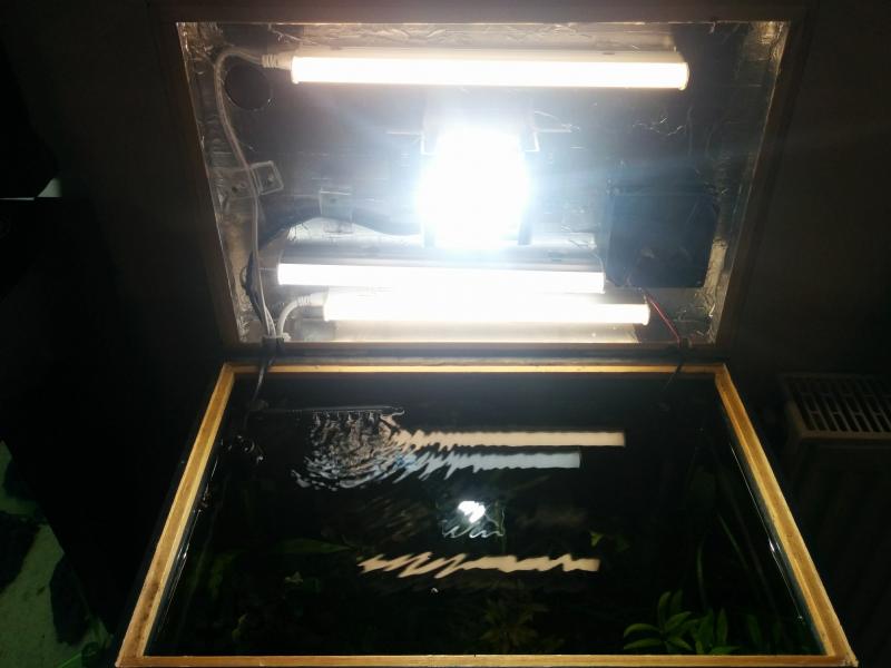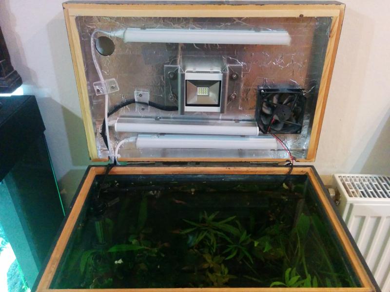 Αναβάθμιση φωτισμού για να υποστηρίξει δυσκολότερα φυτά. Στα 12 watt (820 lumen) που υπήρχαν προστέθηκε ένας προβολέας 10 watt (1050 lumen), οπότε έχω 22 watt σε κάτι λιγότερο από 40 lit. Το αποτέλεσμα είναι άμεσα εμφανές αφού άρχισε να κοκκινίζει μία ludwigia repens rubin που έχω αλλά τα φυτά θέλουν τακτοποίηση ξανά γιατί έχει αρχίσει να επικρατεί ένα χάος