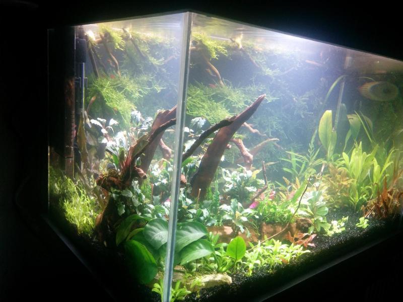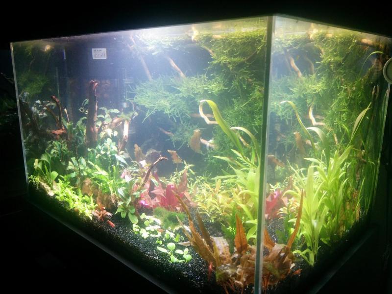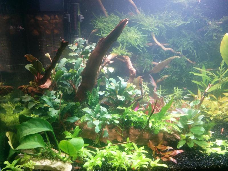 Έγινε πλήρες άδειασμα, αλλαγή χαλικιού και στήσιμο από την αρχή με αρκετά παλιά και νέα φυτά. Το νέο στήσιμο είναι πιο οργανωμένο, τακτοποιημένο και με φυτά που θα δώσουν χρώματα. Προστέθηκαν είδη bucephalandra, staurogyne repens, alternanthera mini, lobelia cardinalis mini, hydrocotyle tripartita, fissidens και riccardia chamedryfolia ενώ έχουν μπει και rotala rotundifolia, ceratopteris και didiplis diandra τα οποία είναι πίσω και αριστερά (τα κρύβει το ξύλο) και δεν φαίνονται. Λογικά θα φουντώσουν, θα πάρουν ύψος και όγκο και θα γεμίσει το ενυδρείο. Με τα περισσεύματα έστησα ένα mini ενυδρείο να δω πως θα πάει και αυτό... |