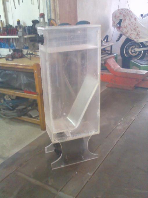 Πείρα κάτι παλιά ρεταλάκια πλέξι γκλας που είχα και ένα αντλιάκι από ένα εσωτερικό φίλτρο και ξεκίνησα. Έκοψα τα κομμάτια με το κοπίδι Πέρασα τα σόκορα στην σβούρα για να είναι εντελώς λείες οι επιφάνειες για κόλλημα. Τρύπησα τον πάτο για να περάσει το στήριγμα της αντλίας Έκοψα μια λωρίδα και αφού την ζέστανα για να της δώσω το σχήμα που πρέπει την έκοψα με το dremel σε μερικά σημεία για να περνά το νερό.