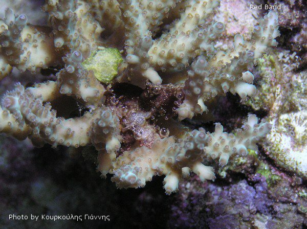 Το κοράλλι που έχει WBD αρχίζει να χάνει τον ιστό του πάντα από την βάση του. Αντίθετα με την BBD δεν φαίνεται κάποιος μικροοργανισμός να είναι υπεύθυνος για την ασθένεια αυτή. Κάποια βακτήρια έχουν βρεθεί σε μολυσμένα κοράλλια αλλά από την άλλη αυτά βρίσκονται και σε υγιή. Εδώ το φιλμ είναι άσπρο δυο χιλιοστών έως 10 πόντων. Η νέκρωση του ιστού μπορεί να φτάσει τα 5 χιλιοστά τη μέρα. 7. Red Band Disease (RBD) Η επαφή πολλές φορές των κοραλλιών μας με κυανοβακτηρίδια, έχει ως αποτέλεσμα την νέκρωση του ιστού από αυτά. Ο νεκρός σκελετός του κοραλλιού σύντομα θα καλυφθεί από τα κυανοβακτηρίδια. 8. Red Bugs (RB) Τα τελευταία χρόνια στα ενυδρεία πολλών χομπιστών έχουν κάνει την εμφάνισή τους τα RB (Tegastes acroporanus). Αυτή η απειλή για όλα τα Acroporidae παίρνει διαστάσεις επιδημίας. Τα RB είναι είδος μαλακόστρακου έχει κίτρινο χρώμα με κόκκινο κεφάλι, με μήκος μόνο περίπου μισό χιλιοστό και είναι πολύ δύσκολο να τα δει κανείς με γυμνό μάτι. Όταν δυστυχώς τα παρατηρήσουμε απλά είναι εκατομμύρια. Τα RB θα αρχίσουν να τρώνε τις Ακρόπορες στο ενυδρείο μας και ειδικότερα την επιφάνειά τους και τα εκκρίματα αυτής. Η ακροπόρα που έχει RB μπορεί να: