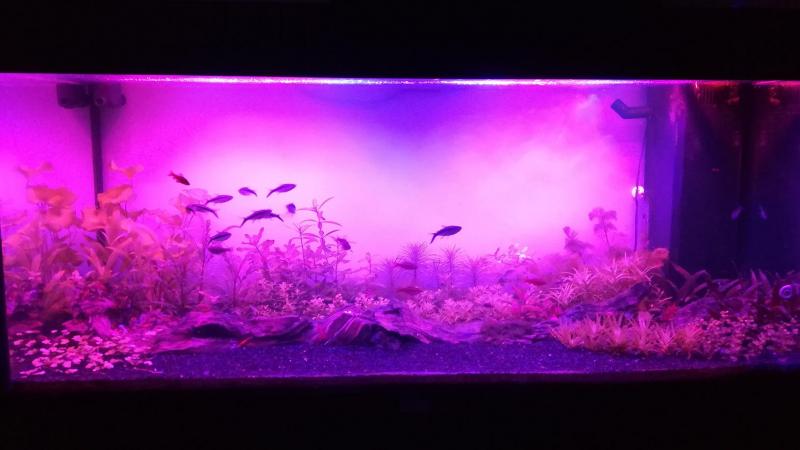 Μπήκε χθες το φωτιστικό led στο ενυδρείο. Αποτελείται από 18 led 6500Κ, 4 led 10000Κ, 4 μπλε και 4 κόκκινα (full spectrum), σύνολο 30 led των 3 watt. Ο συνδυασμός δίνει ευχάριστο οπτικό αποτέλεσμα, ελπίζω και σε ανάλογη ανάπτυξη των φυτών. Κάποιες πρώτες φωτογραφίες