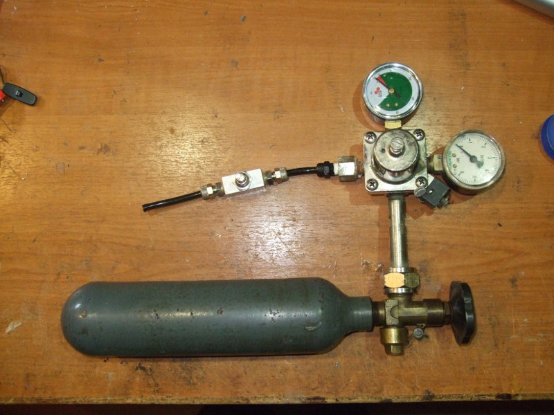 Οι δοκιμες με CO2 πηγαν καλα. Η τιμη του pH εχει διακυμανση μεταξυ 7.01 και 6.99. Στη φωτο η φιαλη 450gr που χρησιμοποιω.Την ανακαλυψα σε ενα μαγαζι με πυροσβεστικα (10Ε και γεματη!). Και ο ρυθμιστης πιεσης μαρκας Heineken που μου δανεισε ο Δημητρης.