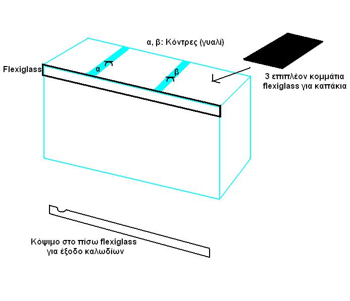 Λοιπόν, κόβεις 2 πιχάκια πλεξιγκλάς λίγο μεγαλύτερα απο το μήκος του ενυδρείου και άλλα 2 ίσα με το βάθος του (μιλάω μόνο για καπάκι). Κολλάς με σιλικόνη το μπροστινό και πίσω μέρος πλεξιγκλάς (ενώ τα έχεις βάψει στο χρώμα που θες με λαδομπογιά για να μη φύγει το χρώμα ή παίρνεις έτοιμα μαύρα πλεξιγκλάς). Το πλεξιγκλάς να προεξέχει πάνω απο το ενυδρείο όταν το κολλήσεις τόσο ώστε να κρύβει ίσα ίσα το πλεξιγκλάς και τα τζάμια που θα είναι στο πάνω μέρος του ενυδρείου (ως καπάκια). Στο πίσω πλεξι κόβεις ένα κομμάτι για να βγαίνουν όλα τα καλώδια, μπορείς να κόψεις και στις 2 πλευρές. Τέλος, κολλάς 2 ωμέγα πλαστικά με σιλικόνη στη μέσα πλευρά-κάτω δηλαδή απο τις γυάλινες κοντρες, ώστε εκεί να πιαστεί το φωτιστικό. Αυτά είχα κάνει εγώ, είναι πολύ εύκολο και φαίνεται πάρα πολυ περιποιημένο το σύνολο. Μπορείς να κάνεισ το ίδιο και για πάτο. Ελπίζω να καταλαβαίνεις κάτι και να σε βοήθησα λίγο. |