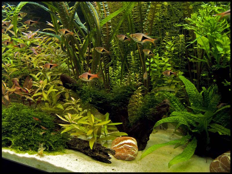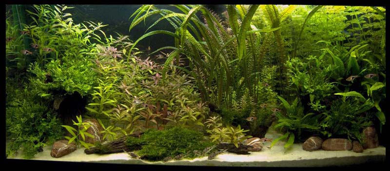 Το πήρα απόφαση να παρουσιάσω και εγώ τον κηπάκο μου, ένα φυτεμένο διακοσάρι με μέτριες απαιτήσεις φωτισμού και συντήρησης που τρέχει επιτυχώς επί πέντε μήνες. Είναι το τρίτο φυτεμένο που στήνω (παρόλο που μέχρι στιγμής έχω κάνει παρουσιάσεις μόνο για μεσογειακά…) που σημαίνει ότι αποφευχθήκαν λάθη και ταλαιπωρίες του παρελθόντος. Από αισθητικής πλευράς επιδέχεται ακόμα βελτιώσεις (πυκνώματα, κλαδέματα και μετατοπίσεις σε διάφορα σημεία) αλλά τα φυτεμένα είναι έτσι κι αλλιώς ενυδρεία σε συνεχή εξέλιξη που δεν τελειώνουν ποτέ…