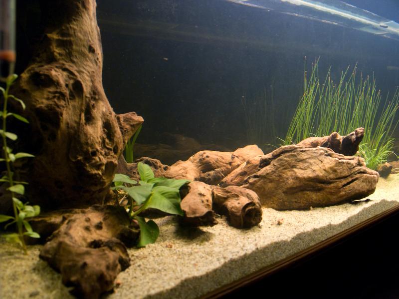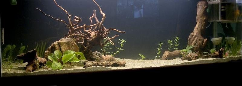 Πιστευω οτι αν και ομορφο στο ματι, τωρα που δεν εχουν μπει ακομα τα φυτα, αργοτερα οι πετρες απο την μια και τα ξυλα απο την αλλη, θα δειχνουν εκτος τοπου εντελως.Οταν εχουμε 2 εντελως διαφορετικης υφης υλικα, καλο ειναι να τα συνδυαζουμε και οχι να τα χωριζουμε γιατι τοτε το στησιμο διαχωριζεται σε 2 διαφορετικα ενυδρεια.