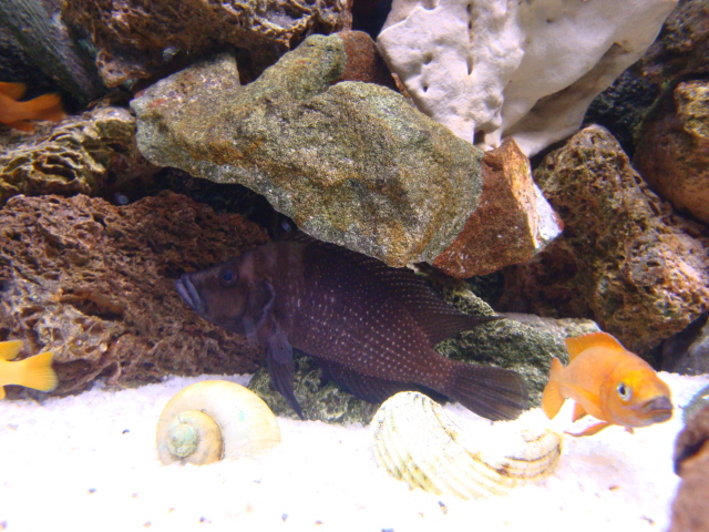 Το ενυδρειο εχει στηθει το 2008 με μικρες αλλαγες μεχρι σημερα, κυριως καποιες πετρες και η διαταξη τους αλλα και στην ψαροσυνθεση η οποια αρχικα ηταν με Α.calvus και Α.compressiceps.Οι πετρες ειναι τοποθετημενες ετσι ωστε να στηριζονται στην πλατη του ενυδρειου αλλα και μεταξυ τους χωρις σιλικονη προσπαθωντας να τις κανω να μοιαζουν με κομματια απο τον βραχο (backround) που εχουν πεσει στον πυθμενα. Διαστάσεις: Ενυδρειο Rena aqualife 350 1,20x0,50x0,70 Όγκος: 350 lt Κατηγορία: Tanganyika Φυτά: 2 βαλισνεριες (οτι εχει μεινει απ΄αυτες) Ψάρια / Άλλα είδη: N.leleupi 1m+5f+(10 μικρα 1 ετους περιπου τα οποια χαριζονται),2m Α.calvus+(1 μικρο αγνωστου φυλου μεχρι στιγμης), 6 νεριτες και πολλα mts Διακοσμητικά υλικά: λευκη χαλαζιακη αμμος, πετρες διαφορων ειδων ασβεστολιθικες και μη, 2 ξυλα. (χαλίκι, ξύλα κ.λ.π.) Φόντο: βραχος της juvel Φωτισμός: 2x30w μια deep blue της sera και μια απλη λευκη (υπαρχει και 2ο φωτιστικο το οποιο δεν το αναβω παρα μονο σε γιορτες και επετειους :D) Διάρκεια φωτισμού: 4 ωρες Φιλτράρισμα: Rena XP3 1350lt/h και Hagen Fluval 306 1150lt/h Θερμοστάτης: Jager 200 με controller haquoss 500 Λίπανση:- Παροχή CO2:- Παράμετροι: pH: 8,5 Γενική σκληρότητα (GH):- Ανθρακική σκληρότητα (ΚΗ):- Αμμωνία (ΝΗ3):0 Νιτρώδη (ΝΟ2):0 Νιτρικά (ΝΟ3):12,5mg/lt Αλλαγές νερού:20% καθε εβδομαδα Θερμοκρασία:25C Άλλες πληροφορίες:Σκοπευω να κρατησω τα ενηλικα leleupi και ψαχνω να βρω κι αλλα καλβακια(white chaitika αν εμφανιστουν ποτε ξανα στην Ελλαδα) .Επισης θα μπουν και μερικες ανουμπιες δεμενες στις πετρες. φωτογραφιες σε λιγο |